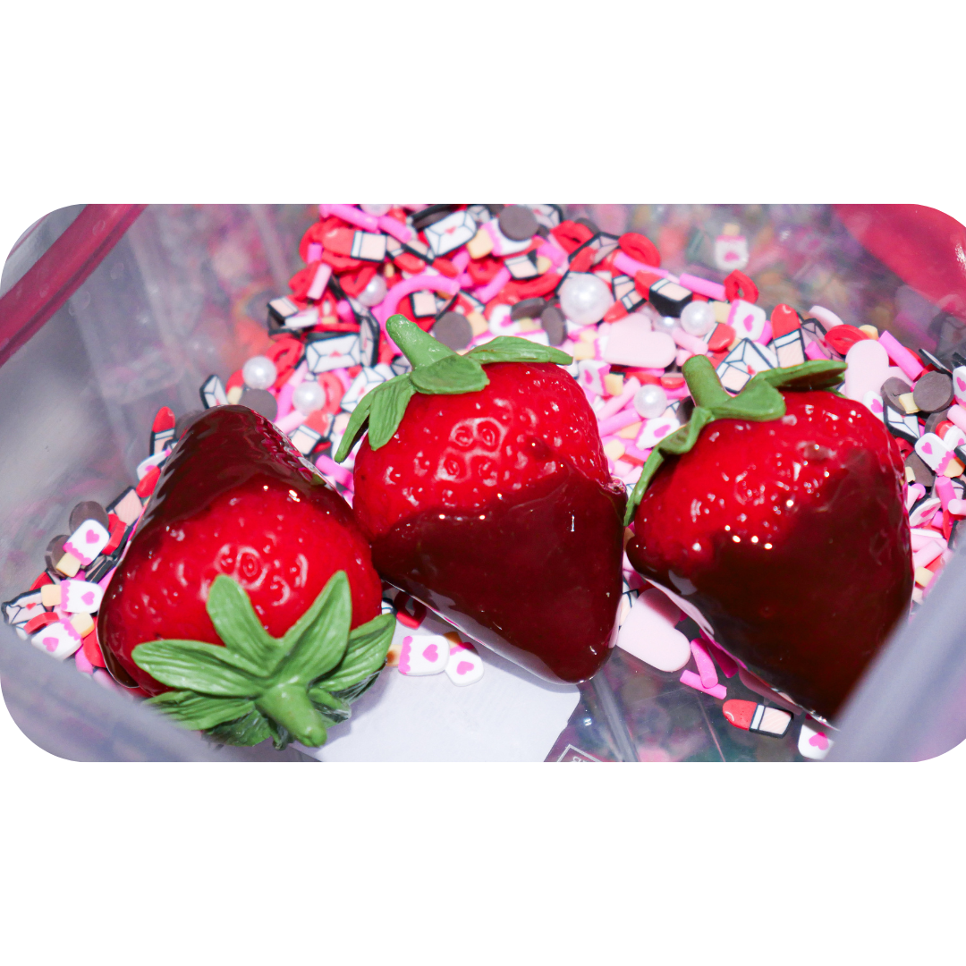 1 accesoriu decorativ, căpșună din clay „în ciocolată” care completează aspectul slime-ului.