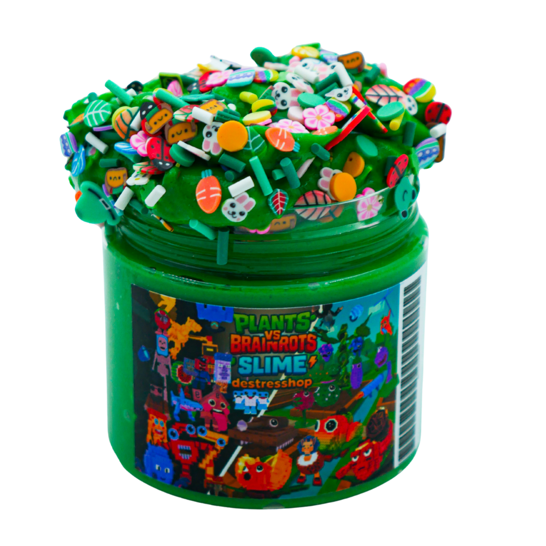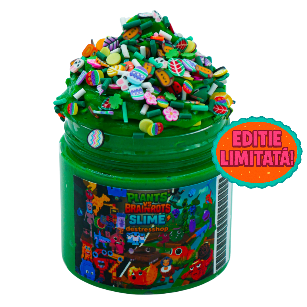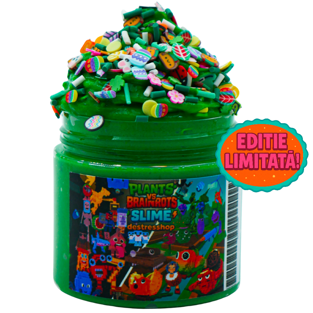 • 1 borcănaș de slime PLANTS VS BRAINROTS SLIME ROBLOX, textură Glossy Snow Fizz, cu efecte crunchy și crackle.